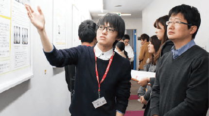 研究の成果をポスターにまとめ、さながら学会のようにプレゼンテーションを行います。
