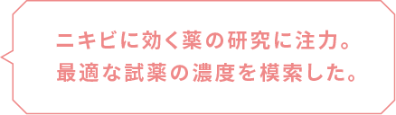 生物の機能を利用して、美白、抗老化、抗ニキビ、抗がん、抗真菌、抗アルツハイマー薬につながる物質を探索し、化粧品や医薬品のもとになる化合物の創薬研究を行っています。