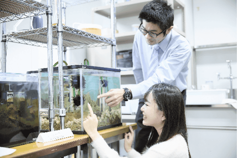 生命科学コースでは、生物がどのように環境に適応し、進化しているかについて学びます。人間も地球上で進化してきた生物の一つなので、生物の理解は私たちの身体の理解につながります。 コースの特徴は、生物の知識を基礎から学べることに加えて、生きものに多く接するカリキュラムにあります。野菜の育成を行うことで生物を飼育することの基礎を学び、ウニの発生の観察、フィールド調査、ビオトープ作り、臨海実習などを通じて生物の多様性を理解します。 生きものの観察では、教科書に書かれていない多様な種を取り扱うため、自ら考えて計画を立てることを重視。計画立案と観察を通じて、社会人基礎力として重要な、未知の問題に対して考え抜く力や、理系卒に欠かせない論理性が身につきます。