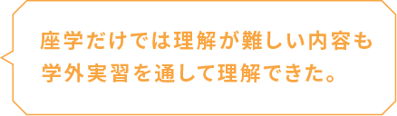 三崎臨海実習所での学外実習では、魚や貝を採取して分類・観察しました。ウニの発生を観察し、受精卵から生体に至るまでのスピードに驚いたことを今でも鮮明に覚えています。また、理化学研究所を訪問して最先端の実験器具に触れたことも印象に残りました。座学だけではイメージすることが難しい内容でしたが、実践的な活動のなかで理解したことで、知識の定着につながったと感じています。